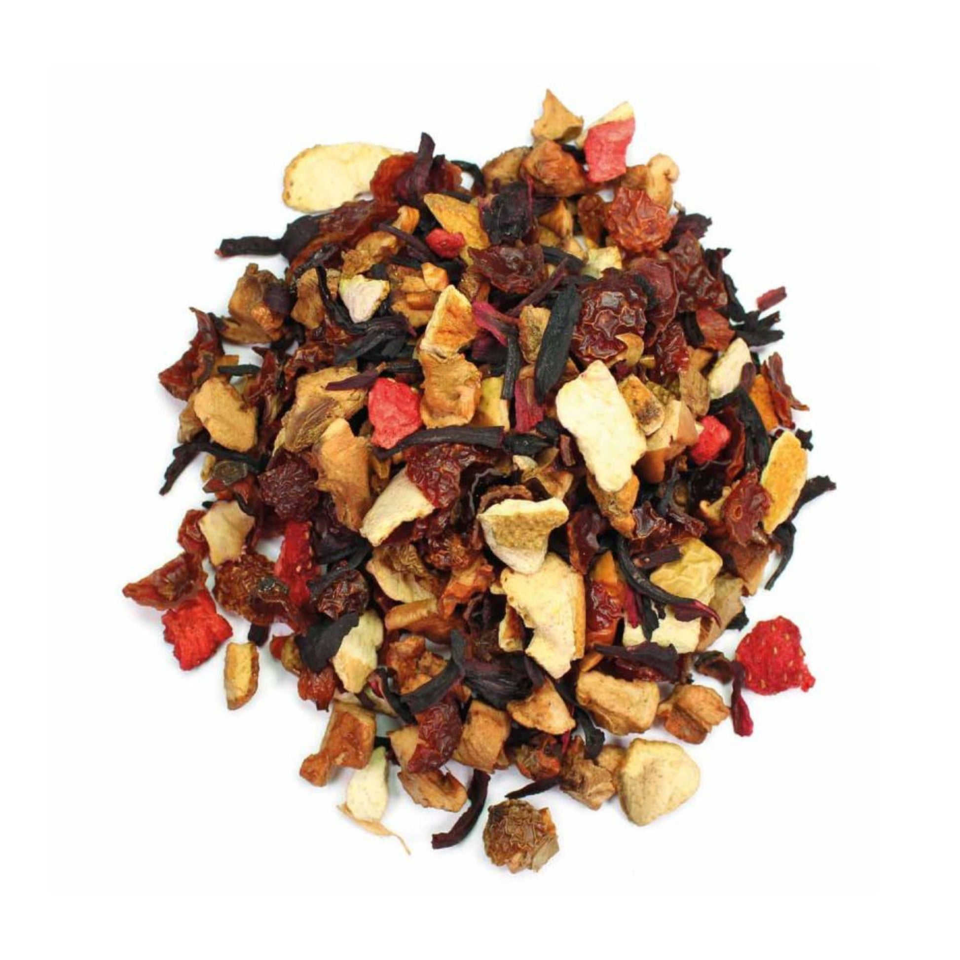 Apfelstücke, Hagebutten, Hibiskus, Orangenschalen (15%), Erdbeeren (3%), natürliches Aroma
