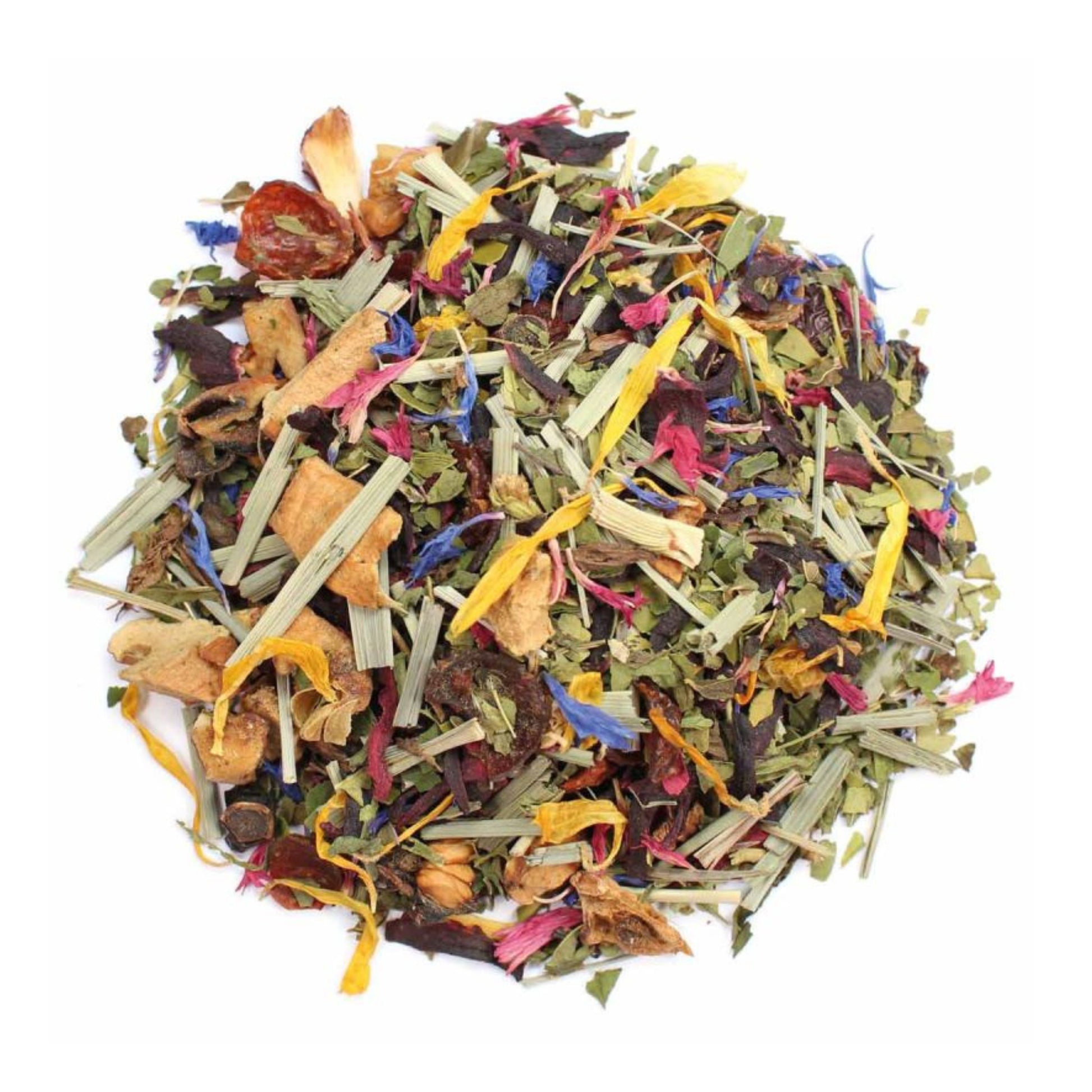 Apfelstücke, Hagebutten, Mate grün (koffeinhaltig), Hibiskus, Lemongras, Pfefferminze, Süßkraut, Kornblumen rot, Kornblumen blau