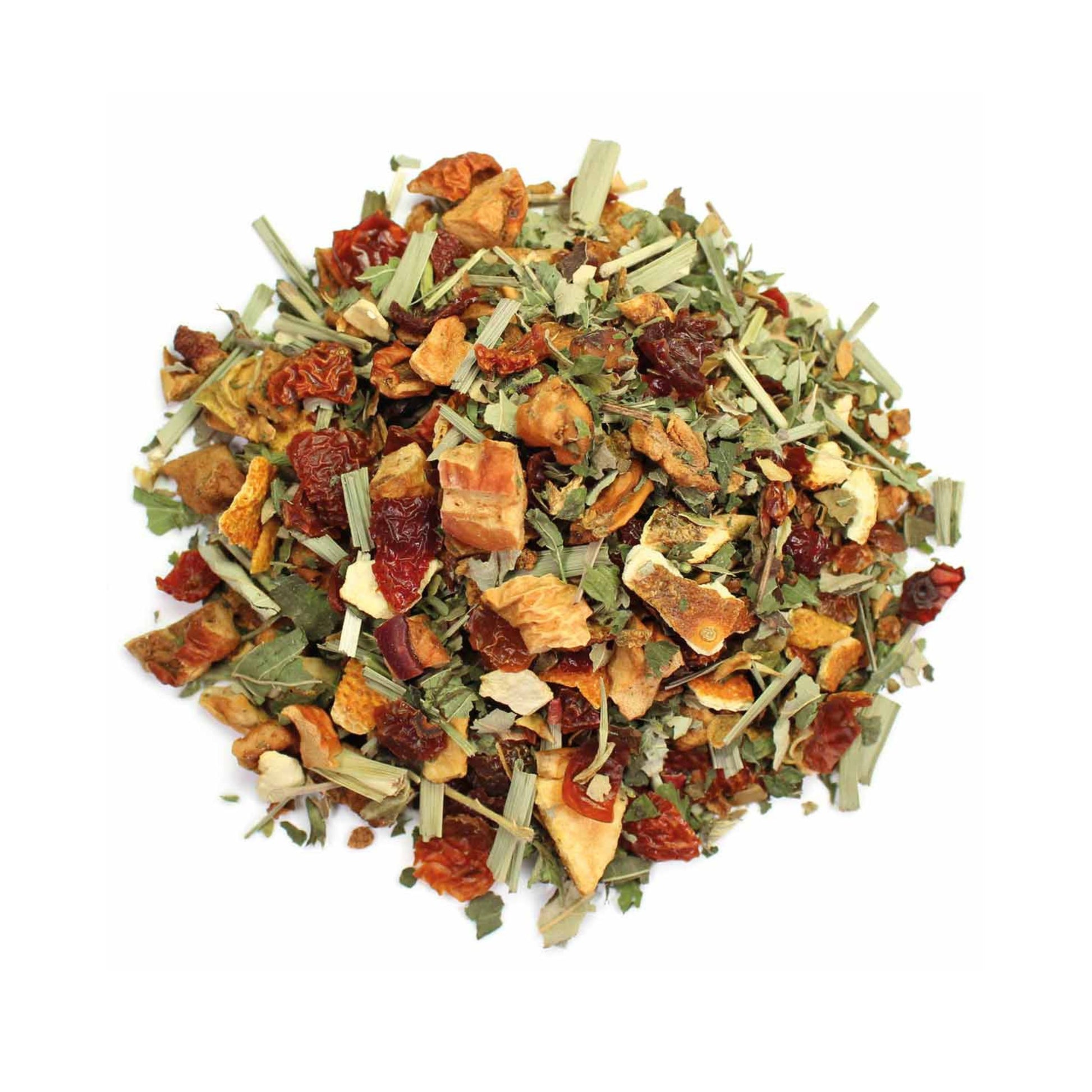 Apfelstücke, Hagebutten, Orangenschalen, Brombeerblätter, Zitronenmelisse (5%), Birnenstücke (3%), natürliches Aroma